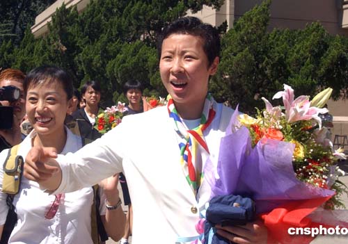 八月三十一日,獲得雅典奧運冠軍的中國女排姑娘們載譽回京,在北京首都國際機場受到各界熱烈歡迎。中新社記者:武仲林