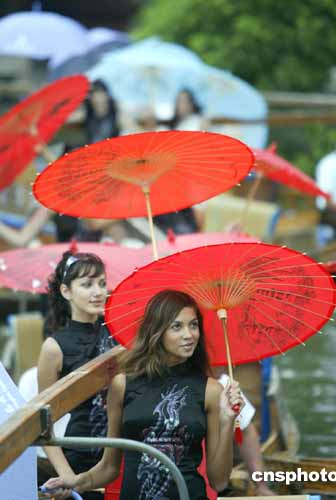 8月31日,參加“時(shí)尚杭州之旅”2004年新絲路世界模特大賽的29個(gè)國家和地區(qū)的40多名參賽佳麗在浙江省杭州乘木船、撐油紙傘泛舟西湖。世界模特大賽決賽將與9月5日在杭州舉行。中新社記者:盛佳鵬