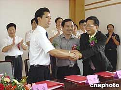 中國—東盟經(jīng)濟園管委會主任韋志鵬(前左一)與一新入駐企業(yè)代表簽約。該區(qū)于二○○三年十二月建立,入駐企業(yè)逐漸增多。作者:楊志雄