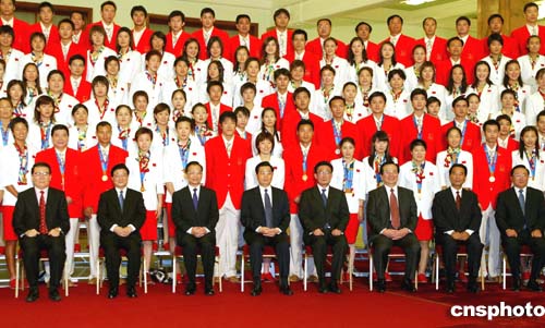 中國國家主席胡錦濤等黨和國家領(lǐng)導(dǎo)人在北京人民大會(huì)堂接見了剛剛從雅典歸來的第28屆中國體育代表團(tuán)全體成員并合影留念。中新社記者:鄭萍萍