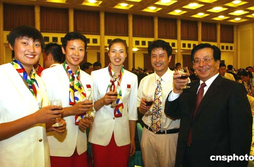 九月二日晚,中共中央辦公廳、國(guó)務(wù)院辦公廳在北京人民大會(huì)堂宴會(huì)廳舉行招待會(huì),歡迎載譽(yù)歸來的第28屆奧運(yùn)會(huì)中國(guó)體育代表團(tuán)。中共中央政治局常委、國(guó)家副主席曾慶紅向獲得奧運(yùn)冠軍的中國(guó)女排祝酒。中新社記者:武仲林