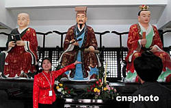 山東臨沂市是古代著名書法家王羲之的家鄉(xiāng),為紀(jì)念其對(duì)中國(guó)文化的貢獻(xiàn)和表達(dá)后人對(duì)他的景仰,當(dāng)?shù)卣谕豸酥啄昃幼√幹匦蘖恕巴豸酥示印。圖為故居內(nèi)王羲之(中)和他的書法弟子塑像。作者:王麗南