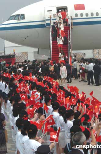 中國(guó)奧運(yùn)金牌代表團(tuán)今天上午十一時(shí)許,乘坐中國(guó)國(guó)際航空公司專機(jī)飛抵香港。