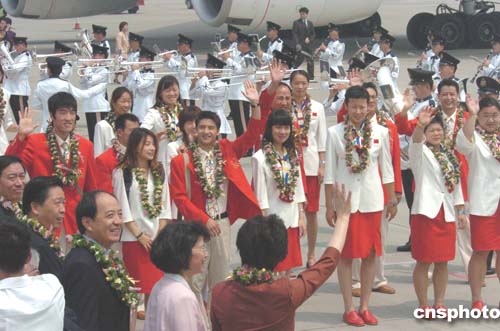 中國(guó)奧運(yùn)金牌代表團(tuán)在機(jī)場(chǎng)受到熱烈歡迎。中新社記者:錢興強(qiáng)