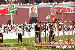 北京市政工人九月五日開始在天安門廣場(chǎng)搭建腳手架,準(zhǔn)備建立組裝國(guó)慶節(jié)的大型花壇,迎接中華人民共和國(guó)成立55周年。中新社記者:鄒憲