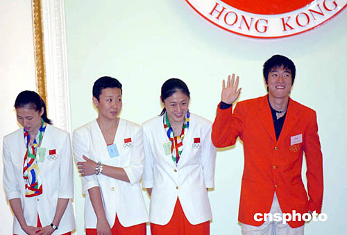 董建華向代表團(tuán)致送了寫有“中國(guó)人的驕傲”的紀(jì)念品,而袁偉民則回贈(zèng)了有所有金牌運(yùn)動(dòng)員簽名的紀(jì)念品。今天晚上,香港體育協(xié)會(huì)暨奧林匹克委員會(huì)還在港麗酒店為代表團(tuán)舉行歡迎晚宴。