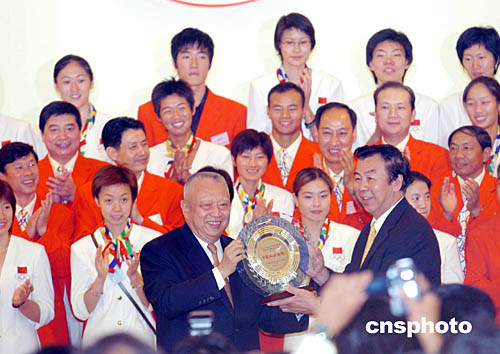 9月6日,香港特區(qū)行政長(zhǎng)官董建華在禮賓府舉行盛大歡迎酒會(huì)上,向中國(guó)奧運(yùn)金牌選手訪港團(tuán)贈(zèng)送“中國(guó)人的驕傲”禮物。