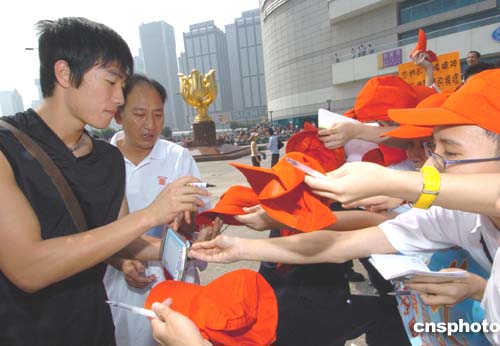 國家奧運金牌代表團9月7日在香港展開觀光之旅,9時45分抵達灣仔金紫荊廣場參觀,吸引大批市民圍觀,其中劉翔最受香港市民的歡迎。作者:趙振清