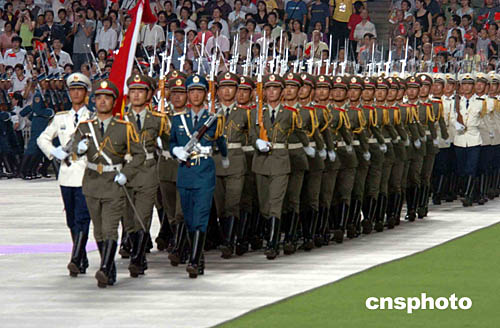 “奧運金牌精英大匯演”7日晚上在香港政府大球場舉行,全場爆滿。圖為解放軍駐港部隊儀仗隊進場。作者:洪少葵