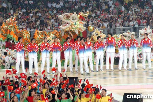 9月7日晚上,位于快活谷的香港大球場(chǎng)成為名副其實(shí)的“歡樂之谷”,國家奧運(yùn)金牌選手和數(shù)萬名香港市民會(huì)聚在此,共享中國在雅典奧運(yùn)會(huì)奪金的喜悅和榮光!皧W運(yùn)精英大匯演”在這里拉開帷幕。圖為女排教練陳忠和帶領(lǐng)全體選手高歌,為晚會(huì)推向高潮。作者:洪少葵