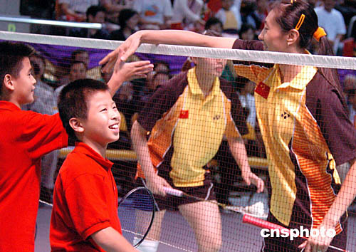 圖為奧運羽毛球金牌運動員與小朋友打球后熱情握手
