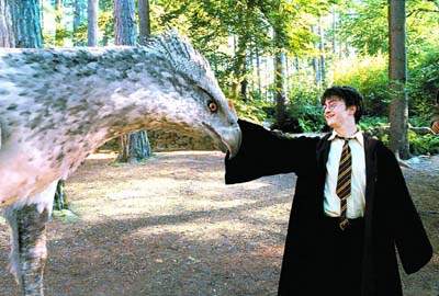 中新網9月9日電 據(jù)信息時報報道,在《哈利·波特3》中,出現(xiàn)很多令人驚異的動物包括烏嘴、鷹頭馬身有翼獸、盧平教授秘密的心魔狼人、阿茲卡班的獄卒攝魂怪。還有魔法交通工具騎士公車、膨脹后的瑪姬姑媽、赫敏的寵物歪腿和羅恩所飼養(yǎng)的老鼠斑斑。