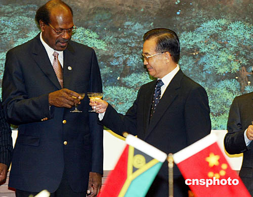 九月九日,中國國務(wù)院總理溫家寶與瓦努阿圖總理沃霍爾共同出席中國向瓦努阿圖提供援助的換文等文本文件的簽字儀式。