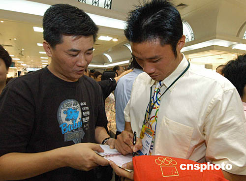 中國雅典奧運(yùn)金牌選手代表團(tuán)九日抵達(dá)澳門訪問,當(dāng)天下午部分選手到商埸輕松購物,金牌選手孟關(guān)良在商埸熱情?澳門市民簽名。作者:梁永強(qiáng)