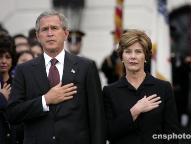 在美東時(shí)間早上八時(shí)四十六分,也是第一架飛機(jī)撞上世貿(mào)大樓北座時(shí),美國(guó)總統(tǒng)布什和紐約市長(zhǎng)布隆伯格分別在華盛頓白宮和紐約世貿(mào)遺址帶領(lǐng)默哀儀式。
