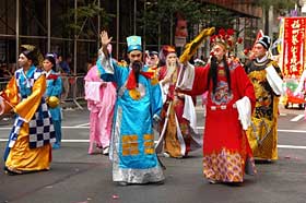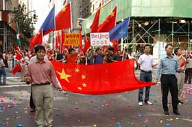 華僑華人和留學(xué)生組成了本次游行中人數(shù)最多、聲勢(shì)最浩大的隊(duì)伍,不但有舞龍、舞獅、鑼鼓,還有腰鼓、秧歌以及表現(xiàn)中國(guó)京劇藝術(shù)、少數(shù)民族服裝等傳統(tǒng)文化的表演分隊(duì),許多路邊的觀眾也揮動(dòng)中國(guó)國(guó)旗并熱烈鼓掌。