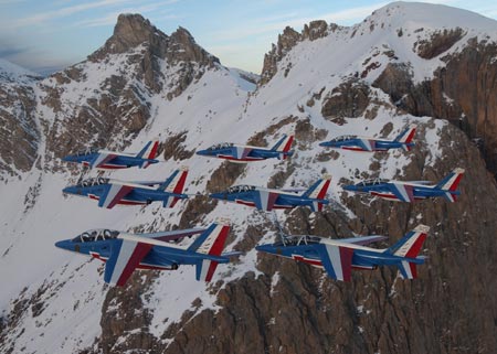 法國空軍的“法蘭西巡邏兵”飛行表演隊(duì)正式成立于1964年2月。飛行表演隊(duì)的飛機(jī)涂著同法國國旗一樣的紅、白、藍(lán)三種顏色,機(jī)群在空中做飛行表演時(shí)也常常把著三種顏色的煙跡留在空中。它象征著“自由”(紅色)、“民主”(白色)、“博愛”(藍(lán)色),體現(xiàn)了法國人民勇敢、浪漫的傳統(tǒng)和對(duì)未來美好的愿望。圖為8機(jī)正方形編隊(duì)(來源:艦船知識(shí)網(wǎng)絡(luò)版)