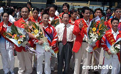九月十三日上午,在第二十八屆雅典奧運(yùn)會上取得一金二銀一銅歷史最好成績的閩藉部分獲獎運(yùn)動員石智勇(前排左三)、吳美錦(前排右一)、黃珊汕(前排左一),教練員陳忠和(前排右二)、陳文斌(前排左二)等從北京載譽(yù)返閩抵達(dá)福州長樂國際機(jī)場,受到福建省各界人士的熱烈歡迎。作者:劉可耕