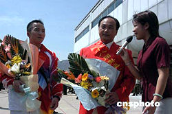 率弟子石智勇、吳美錦在第二十八屆雅典奧運(yùn)會上分別奪得男子舉重六十二公斤級金牌、五十六公斤級銀牌的著名舉重教練陳文斌(圖中),九月十三日載譽(yù)回到家鄉(xiāng)福建,成為當(dāng)?shù)孛襟w記者爭先采訪的主角。作者:劉可耕