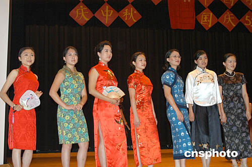 華盛頓的中國留美學(xué)生當(dāng)?shù)貢r(shí)間九月十二日晚舉行聯(lián)歡會(huì)慶祝國慶55周年,歡度中秋佳節(jié)。這是女留學(xué)生表演的具有中國民族特色的旗袍秀。作者:余東暉