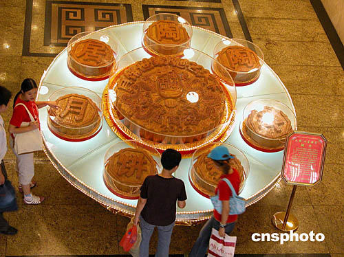 中秋將至,有“月餅泰斗”之稱的廣州陶陶居酒家推出巨無霸月餅“七星伴月”,中間的大月餅直徑達(dá)168厘米、重318公斤。作者:劉衛(wèi)勇