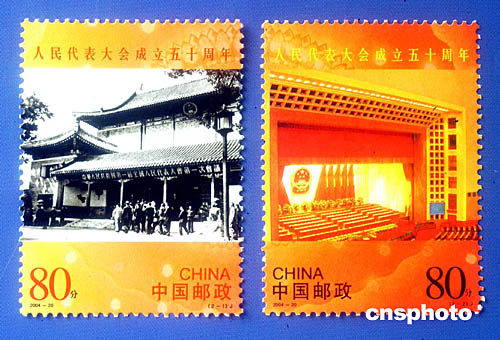 為紀(jì)念全國(guó)人民代表大會(huì)成立五十周年,國(guó)家郵政局定于9月15日發(fā)行《人民代表大會(huì)成立五十周年》紀(jì)念郵票1套2枚,兩枚郵票的名稱分別為:一屆全國(guó)人大一次會(huì)議在中南海懷仁堂舉行、莊嚴(yán)的人民大會(huì)堂主席臺(tái),兩枚郵票的面值均為80分。中華人民共和國(guó)第一屆全國(guó)人民代表大會(huì)第一次會(huì)議于1954年9月15日在北京召開。中新社記者:鄒憲