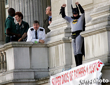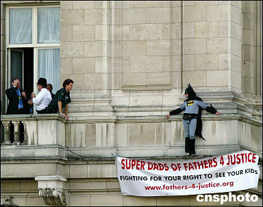 這名抗議者詹森·哈奇,今年32歲,是英國(guó)維護(hù)父權(quán)組織“為父親討公道(Fathers 4 Justice)”的一名成員,他扮成蝙蝠俠模樣,闖入女王伊麗莎白二世居住的白金漢宮,爬上宮殿正面一個(gè)陽(yáng)臺(tái),又從陽(yáng)臺(tái)走到危險(xiǎn)的墻檐上,引來(lái)大群圍觀者。大為尷尬的白金漢宮安全官員當(dāng)天晚上即對(duì)此事展開(kāi)調(diào)查。