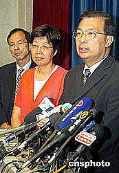 圖為會(huì)后譚耀宗向新聞界作簡(jiǎn)報(bào)。