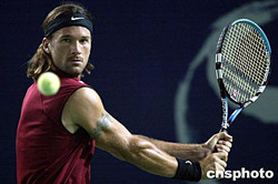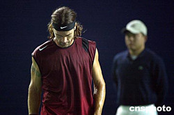 中國網(wǎng)球公開賽男單比賽九月十五日晚在北京網(wǎng)球中心中央球場繼續(xù)進(jìn)行,賽會頭號種子西班牙名將莫亞以零比二不敵法國選手特松加,爆出本屆中國網(wǎng)球公開賽最大冷門,無緣晉級下一輪。中新社記者:盛佳鵬