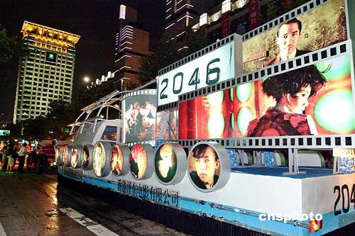 九月十九日晚,二○○四上海國際旅游節(jié)花車大巡游在一片歡慶的鑼鼓聲中閃亮登場,其中香港導(dǎo)演王家衛(wèi)的新作“2046”也借機(jī)在現(xiàn)場宣傳造勢。作者:湯彥俊
