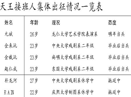 正當(dāng)宋承憲、張赫、韓在石“非法逃兵役”事件受到各界關(guān)注時,還沒當(dāng)兵的天王接班人元斌、金來沅、金載沅、趙仁成、RAIN即將面臨同樣的問題,可以想像的是,他們會記取前車之鑒而不敢造次。韓國男星沒當(dāng)兵的人實在太多,許多小天王為了自己大好演藝事業(yè),不敢面對現(xiàn)實,一再以休學(xué)來拖延當(dāng)兵,年紀(jì)都二十郎當(dāng)了,還在念大一、大二,不然就像樸龍河一樣到了27歲還沒畢業(yè)去當(dāng)兵。