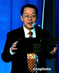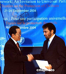 當(dāng)?shù)貢r(shí)間九月二十二日,中國常駐聯(lián)合國代表王光亞(左)在紐約聯(lián)合國總部向安南秘書長的代表交存了中國加入《聯(lián)合國人員和有關(guān)人員安全公約》的加入書。三十天后,該公約將對(duì)中國生效。作者:趙海燕