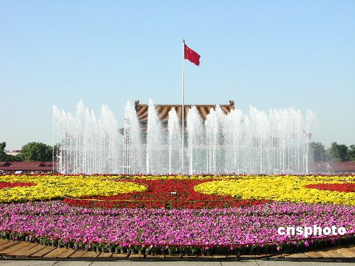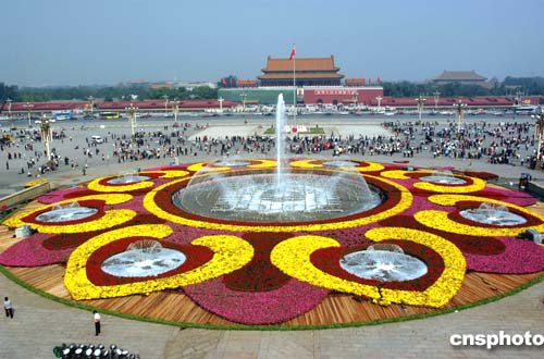 今年天安門廣場花壇布景總體格局是以“萬眾一心”主花壇為主,東西兩側(cè)分別以畫卷式花壇以及大型組字燈箱花壇構(gòu)成!叭f眾一心”主花壇直徑達(dá)72米,中心是一個(gè)直徑30米的大型噴泉。東側(cè)畫卷式花壇自北向南由神舟五號(hào)發(fā)射塔和高科技符號(hào)等組成。西側(cè)畫卷式花壇以延安寶塔為主景,體現(xiàn)出“巍巍寶塔大河奔流,江山多錦繡”的設(shè)計(jì)主題。