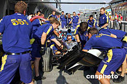九月二十六日F1中國大獎(jiǎng)賽將在上海國際賽車場舉行。連日來,參賽車隊(duì)積極做好各項(xiàng)充分準(zhǔn)備。圖為英美車隊(duì)加緊練習(xí)如何快速維修賽車。作者:潘索菲