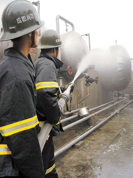 成都市消防支隊緊急調(diào)集城區(qū)10個中隊共40輛消防車趕往現(xiàn)場,并立即啟動“104油庫應(yīng)急預(yù)案”。幾分鐘之后,油庫周圍的居民全部撤離,接著便看見鳴著警笛的消防車接連不斷地開進了油庫。