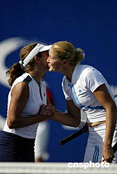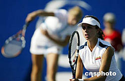 九月二十五日,中國網(wǎng)球公開賽女子雙打比賽繼續(xù)在北京網(wǎng)球中心進行,在中央球場進行的女雙半決賽中,俄羅斯選手薩芬娜(右)與瑞士選手加格里亞蒂二比一戰(zhàn)勝中國選手、雅典奧運會網(wǎng)球女子雙打冠軍李婷和孫甜甜,順利晉級決賽。作者:盛佳鵬