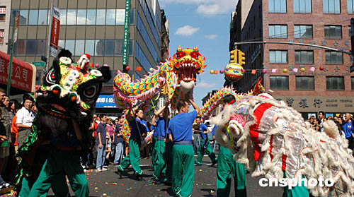 美東時間九月二十六日,紐約秋高氣爽。由“九一一”以后成立的繁榮華埠社主辦的慶中秋文藝燈節(jié)舉行,慶;顒訌闹形绯掷m(xù)到傍晚,華埠鑼鼓鏗鏘,獅龍競舞。作者:龔文謨