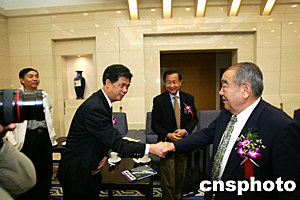 中國(guó)新聞社總編輯郭招金和九屆全國(guó)人大副委員長(zhǎng)布赫親切握手