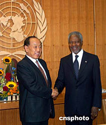 當(dāng)?shù)貢r間九月二十七日,正在紐約聯(lián)合國總部出席第五十九屆聯(lián)大的中國外長李肇星與聯(lián)合國秘書長安南會晤,雙方就聯(lián)合國作用、改革和發(fā)展以及蘇丹達爾富爾等問題交換了看法。作者:趙海燕