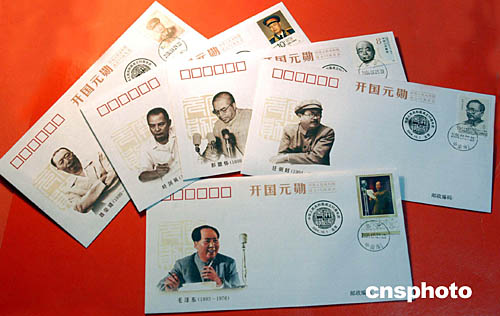 | 在慶祝中華人民共和國成立五十五周年之際,中國郵票博物館九月二十九日出品發(fā)行了一套十五枚《開國元勛》絹質(zhì)紀念封!堕_國元勛》絹質(zhì)紀念封其中印有毛澤東、周恩來、劉少奇、朱德、任弼時、鄧小平、陳云、彭德懷、劉伯承、賀龍、陳毅、羅榮桓、徐向前、聶榮臻、葉劍英等開國元勛的生活圖象和貼有相應(yīng)肖像郵票。這套絹質(zhì)紀念封也被收納在中國郵票博物館于當日發(fā)行的《開國元勛》金銀郵品典藏冊之中。中新社記者:鄒憲
