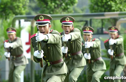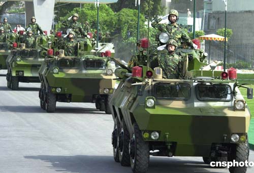 上午,當(dāng)澳門特別行政區(qū)行政長(zhǎng)官何厚鏵、澳門中聯(lián)辦主任白志健和多位特區(qū)政府官員及社會(huì)各界人士進(jìn)入營(yíng)區(qū)時(shí),受到駐澳門部隊(duì)司令員劉聯(lián)華少將、政治委員楊忠民少將等駐軍官兵熱烈歡迎,特首與市民興致勃勃觀看了升國(guó)旗儀式、儀仗隊(duì)隊(duì)列操槍、刺殺團(tuán)體操、裝甲車縱隊(duì)行進(jìn)等軍事科目表演,官兵精湛的軍事技術(shù)、良好的精神風(fēng)貌,贏得了澳門市民的陣陣掌聲。