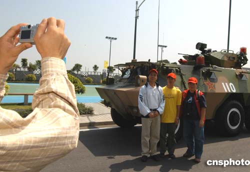 進(jìn)入營(yíng)區(qū)參觀的市民最大興趣的是,觀看軍事科目表演和部隊(duì)武器裝備展示,他們紛紛在裝甲車前拍攝留念,對(duì)武器裝備更是愛不釋手。