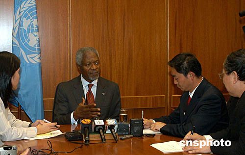 中新網(wǎng)聯(lián)合國10月6日電(記者 陳建)聯(lián)合國秘書長(zhǎng)安南有望今秋訪華。美東時(shí)間十月六日下午,他在紐約聯(lián)合國總部接受了中國記者的聯(lián)合采訪。安南說,在他的日程表上,有三件事最緊要:法治、改革、發(fā)展。