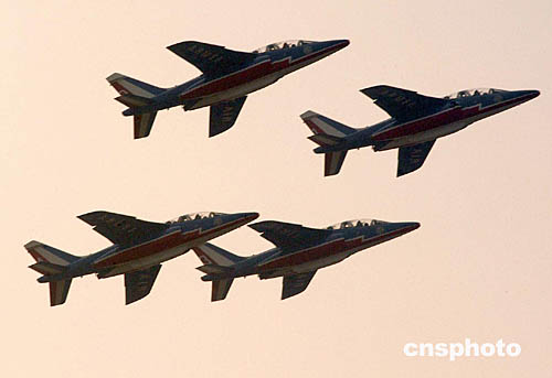“法蘭西巡邏兵”特技飛行表演隊“阿爾法”飛機,十月六日下午在北京南苑機場進行飛行預演,精彩的飛行表演,博得北京觀眾喝彩。由于天氣能見度極低,許多高難度飛行科目未能如期進行。中新社記者:鄒憲