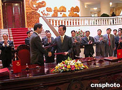 正在這里進(jìn)行正式訪問的中國國務(wù)院總理溫家寶和越南總理潘文凱出席了簽字儀式。
