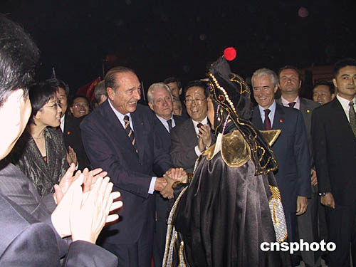 法蘭西共和國(guó)總統(tǒng)雅克·希拉克一行于八日晚22時(shí)抵達(dá)訪華首站--四川省成都市,在雙流國(guó)際機(jī)場(chǎng),受到了中國(guó)國(guó)家副主席曾慶紅、中共四川省委書記張學(xué)忠等官員和各界人士的熱烈歡迎。對(duì)川劇界人士表演的變臉等川劇絕活,希拉克總統(tǒng)興味甚濃,頻頻停下腳步與他們交談。作者:楊杰