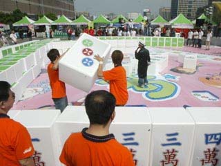 中新網(wǎng)10月9日電 臺北一家網(wǎng)絡(luò)麻將游戲公司今日舉辦了一場別開生面的超級大麻將比賽,參賽者必須使用90厘米長、60厘米寬及50厘米高的麻將一決勝負(fù),第一名將獲得獎金新臺幣1萬元。