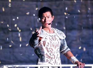 在與歌迷合唱完《如果你是我的傳說》《天意》《愛不完》后,劉德華換了一身銀色武士裝,以《愛該怎么繼續(xù)》《來生緣》等歌曲串連成一出英雄救美不成的凄美愛情故事。舞臺中央先是出現(xiàn)了一條高達(dá)5米的金色眼鏡蛇,隨著音樂節(jié)奏不停地晃動,一只白色的大獅子又走了上來。劉德華為了救愛人,不時地與壞人搏斗,最后只能看著愛人被壞人帶走。孤單的華仔站到10米高的升降臺上,以《孤星淚》結(jié)束了這幕演出。站到升降臺上,華仔很興奮地與最遠(yuǎn)處歌迷打招呼,稱這是“彌補(bǔ)不能走到歌迷身邊的最好的辦法”。隨著高度的遞增,他坦承“有點(diǎn)緊張”,希望暫時終止與歌迷的交談。