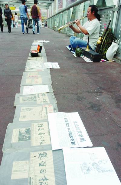 他面前的地上除了用來賣藝的薩克斯管、巴烏、嗩吶、笛子和葫蘆絲,還有20多份攤在地上的報紙剪報,剪報的內容全都是包括《華西都市報》《重慶晚報》在內的山東、四川等地地方報紙對他的相關報道。