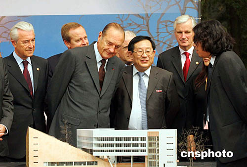 演講之前,希拉克出席了中法中心的奠基儀式。他一邊聽(tīng)講解,一邊仔細(xì)觀看了即將破土動(dòng)工的中法中心模型。他在演講中說(shuō),很高興能夠參觀中法科技創(chuàng)新中心的建筑模型,并稱之為中法合作精神的重要體現(xiàn)。